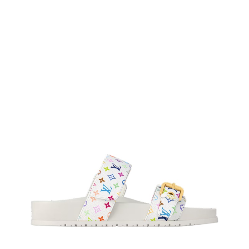 The Bom Dia comfort mule is crafted from Monogram Multicolore canvas, a joyful interpretation of the iconic Louis Vuitton Monogram by Japanese artist Takashi Murakami. This relaxed model has two adjustable straps: one with a gold-toned buckle and eyelets, the other with velcro. Its anatomic footbed and rubber outsole provide all-day comfort.