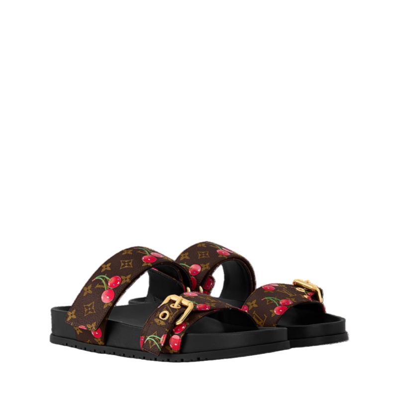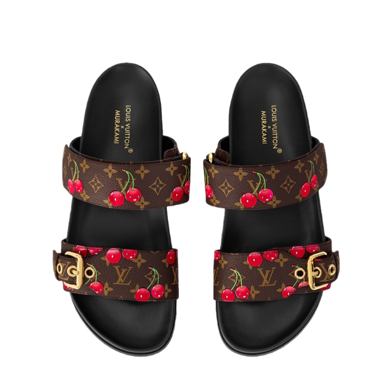 The staple Bom Dia flat comfort mule is elevated into a chic statement as part of the celebratory second edition of the Louis Vuitton x Takashi Murakami collection. Crafted from classic Monogram canvas layered with vibrant cherry motifs, one strap is effortlessly adjusted with velcro, while the other is fastened with a gleaming golden buckle. Complete with an anatomic insole and slip-resistant outsole for casual everyday wear.