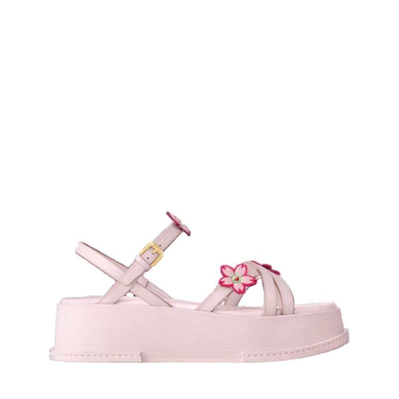 The Maya flatform sandal makes a spirited statement as part of the re-edition of the coveted cross-category Louis Vuitton x Takashi Murakami collection. Crafted from textured Epi grained calf leather in a fresh shade of pink, the proportions of the chunky platform are offset by the upper’s slim straps, which are embellished with vibrant Cherry Blossom patches in the Japanese artist’s vernacular playful style.