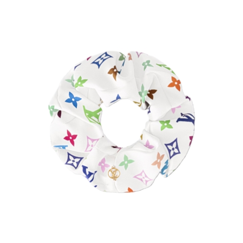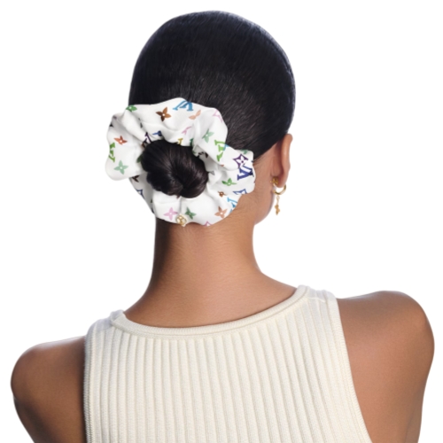 The LV x TM Monogram Multicolor Chouchou (French for “scrunchie”) hails from the season’s exclusive collection designed in collaboration by Louis Vuitton and noted Japanese artist Takashi Murakami. This pure silk hair accessory is printed with Murakami’s colorful take on the Maison’s emblematic Monogram motif, featuring 33 vibrant hues. A fun, feminine piece, it is finished with a golden LV Circle charm. A perfect match for the bags, shoes and fashion jewelry offered in the Louis Vuitton x Murakami collection.