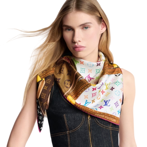 The striking design of the LV x TM Monogram Multicolor Collector square was inspired by the House’s high-profile collaboration with the renowned Japanese artist Takashi Murakami. Crafted in sumptuous silk, it depicts iconic luggage creations adorned with the classic Monogram pattern or Murakami’s upbeat, brightly colored reinterpretation. An original, stylish way to wear a timeless Louis Vuitton look.