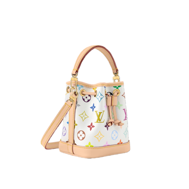 Marking 130 years of the iconic Monogram, this celebratory edition of the Nano Noé showcases the emblematic pattern in a joyful multicolor palette. From the Louis Vuitton x Murakami collection, it is crafted from canvas trimmed with cowhide and adorned with gold-toned hardware. The petite yet functional design is sized to fit everyday essentials and has a removable handle and strap, offering multiple styling options.
