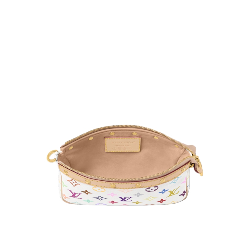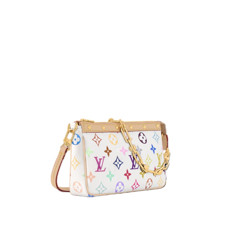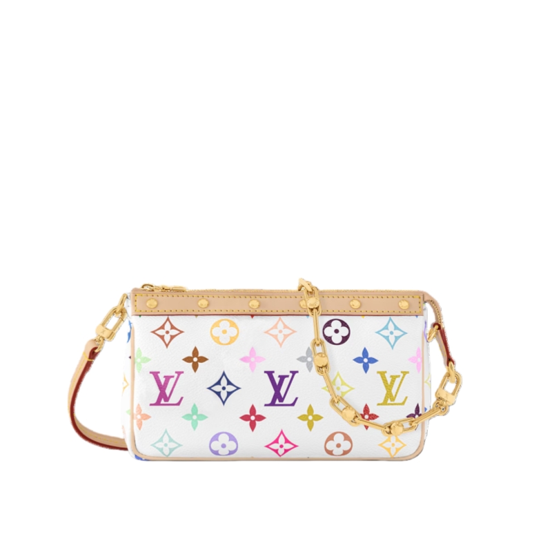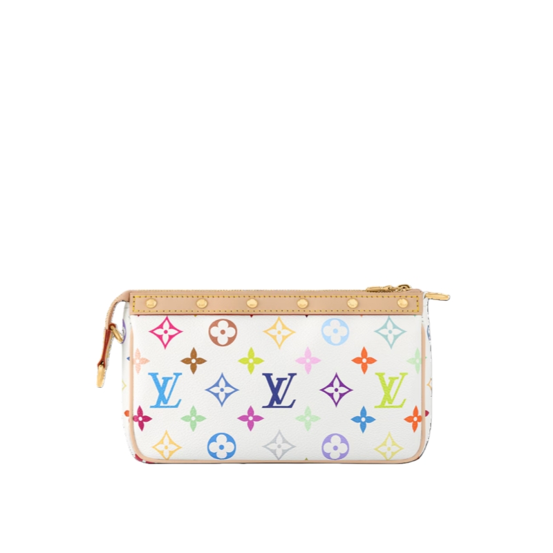 This playful edition of the classic Pochette Accessoires is joyfully reimagined with a multicolored Monogram motif as part of the cross-category Louis Vuitton x Murakami collection. Crafted from coated canvas in a petite pouch shape, a natural cowhide-leather trim adds an emblematic House touch, while golden hardware introduces a chic polished accent. Complete with a removable strap and chain for versatile styling options.