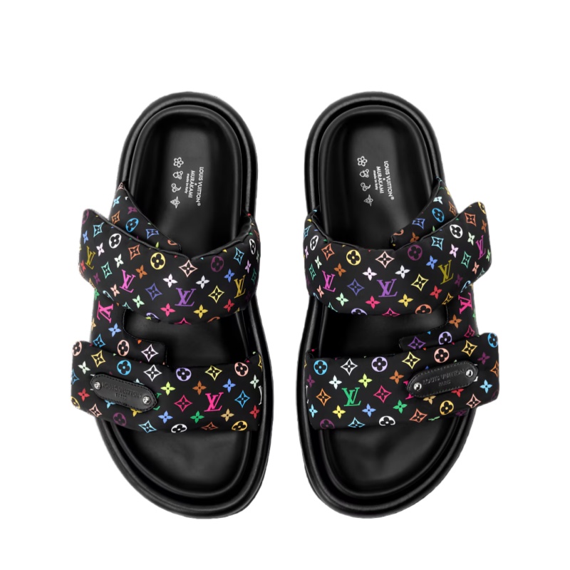 The Pool Pillow comfort mule is revisited in nylon printed with the joyful Monogram Multicolore pattern designed for the House by Japanese artist Takashi Murakami. This model features two puffy, pillow-like velcro straps, one of which is embellished with a natural leather label bearing the Louis Vuitton signature. It is finished with a lightweight micro outsole.