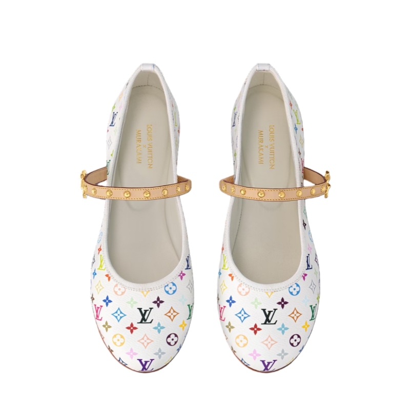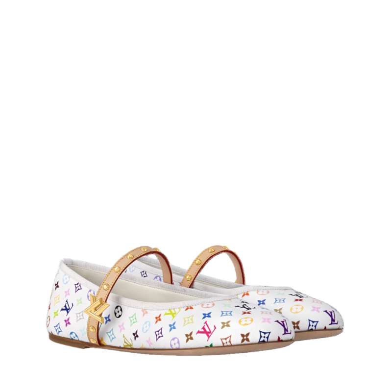 The Romy flat ballerina pump makes a playful statement in a multicolored Monogram motif from the re-edition of the Louis Vuitton x Murakami collection, which twists the House’s iconic signature with bold rainbow tones inspired by the artist’s go-to palette. Crafted from coated canvas with a supple leather outsole, they are lightweight and comfortable for everyday styling, fastened with a chic studded strap trimmed with an LV Twist accessory.
