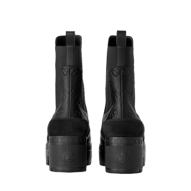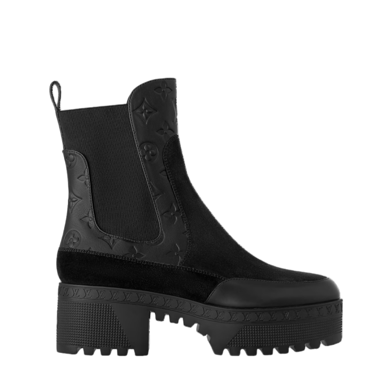 The Laureate platform Chelsea boot is a reinterpretation of one of Louis Vuitton's emblematic styles. It comes in suede calf leather with trim in smooth leather debossed with the Monogram pattern. This model is characterized by its lightweight platform outsole, which is embellished with a pattern of tiny LV Initials inspired by the lozine edging of the House's historic trunks.