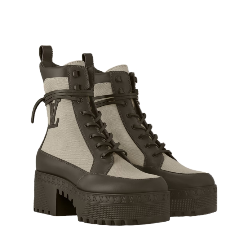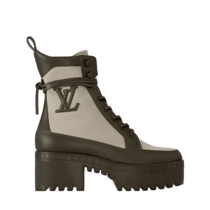 The iconic Laureate platform desert boot is revisited in canvas with calf-leather trim. The color palette and combination of materials give this style a subtle military vibe, complementing its long leather laces and treaded rubber outsole. An LV Initials signature features on the side, while the outsole is decorated with a row of LV Initials.