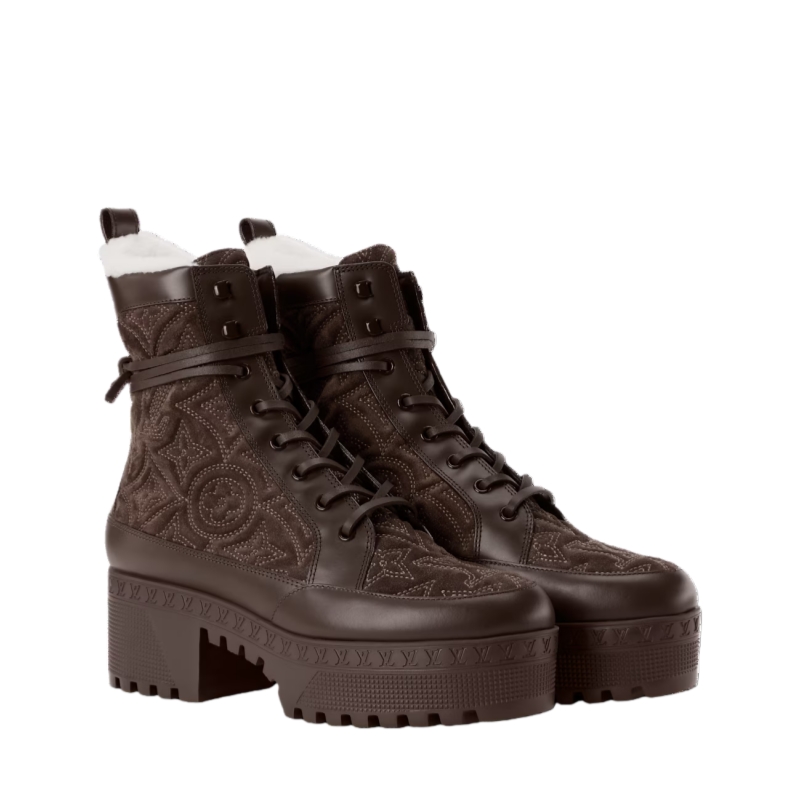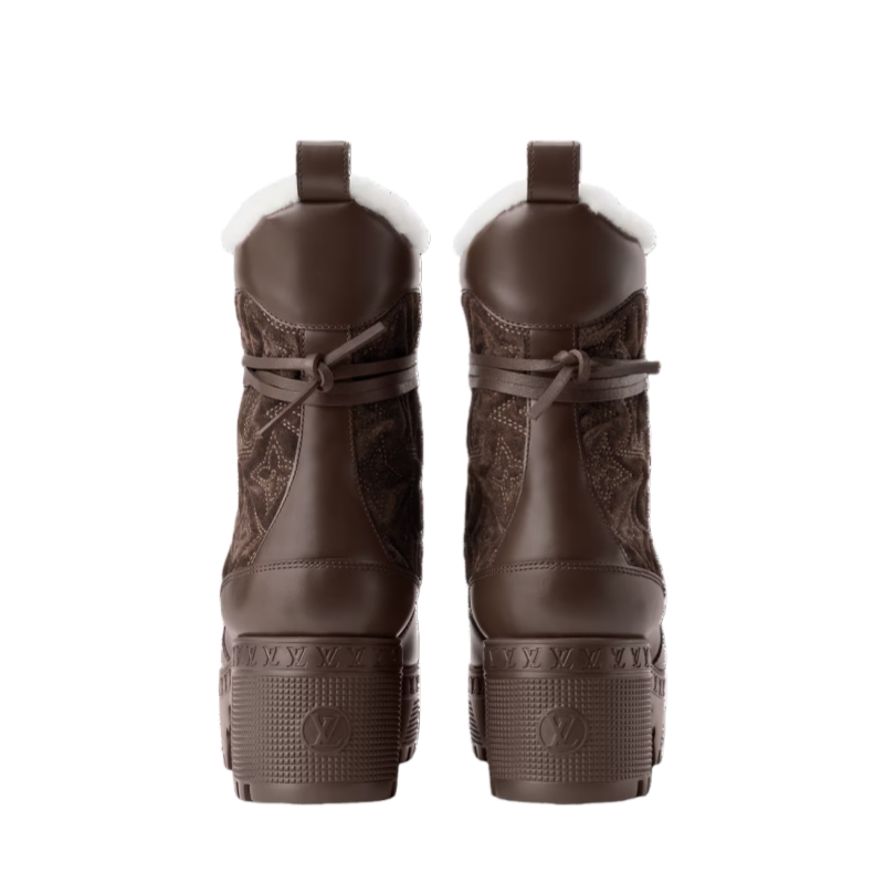 The emblematic Laureate platform desert boot is reinterpreted in Monogram-embroidered suede calf leather with smooth leather trim. Key details of this design are its cozy shearling lining and long leather laces, which wrap around the ankle. The treaded rubber outsole is decorated with a row of LV Initials, inspired by the lozine edging of Louis Vuitton trunks.