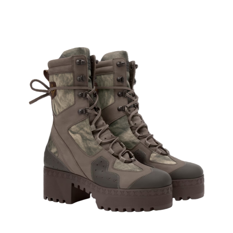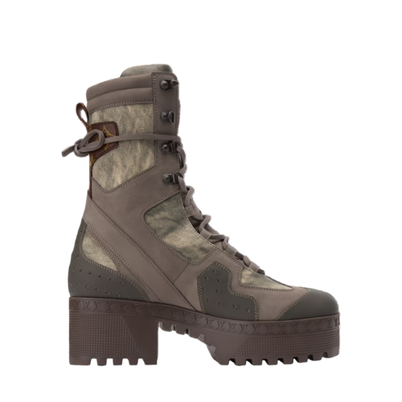 The iconic Laureate platform desert boot is revisited in the spirit of the Fall-Winter 2025 women's show. The upper combines canvas and rubberized calf leather with trim in Monogram canvas. Characterized by its long leather laces which wrap around the ankle, this model is signed with a rubber Louis Vuitton label on the tongue.