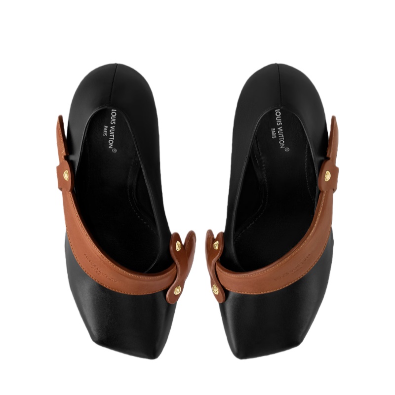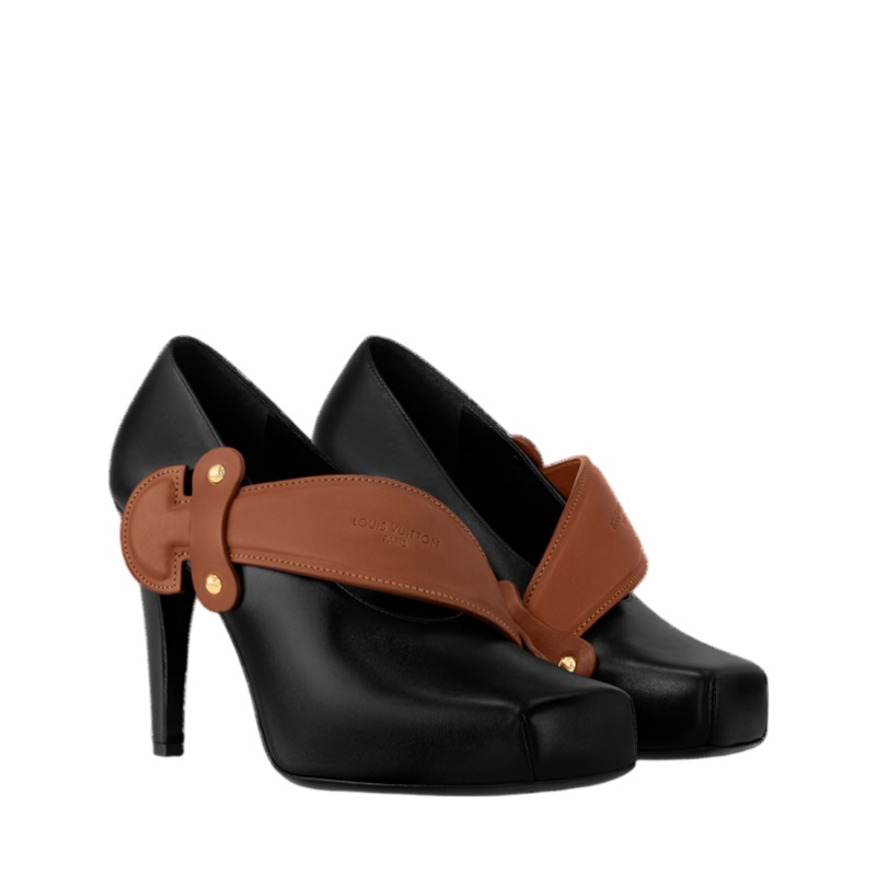 The Legacy pump in smooth calf leather was seen on the runway at the Louis Vuitton Spring-Summer 2025 show. This fashion-forward style is characterized by its distinctive strap, inspired by trunk handles and embellished with gold-toned studs, referencing the House's travel heritage. A bold square toe, integrated platform and high heel complete this design.