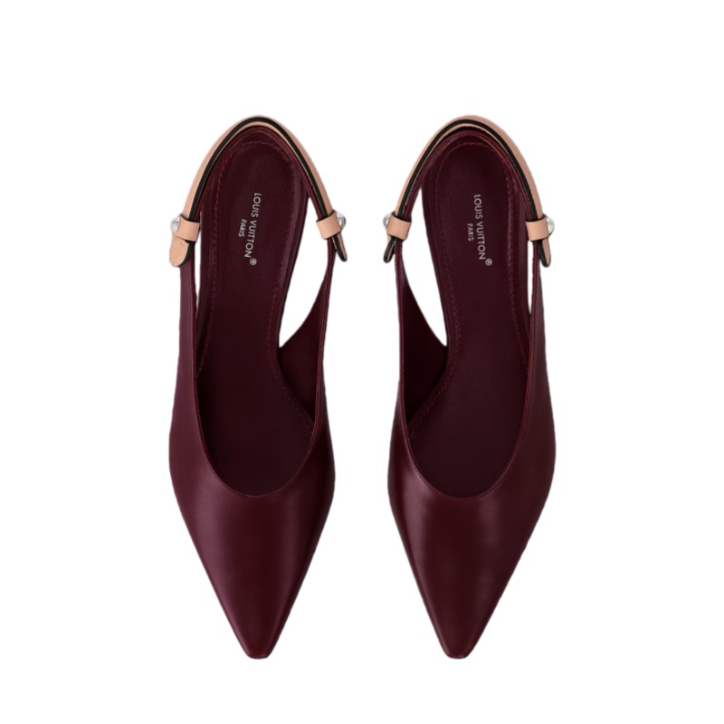 The Legacy slingback pump in smooth calf leather takes inspiration from the House's travel heritage for its key detail: a back strap in natural leather shaped like the handle of a Louis Vuitton trunk. Engraved metal studs further embellish this refined style, which is distinguished by its pointed toe and easy-to-wear kitten heel.