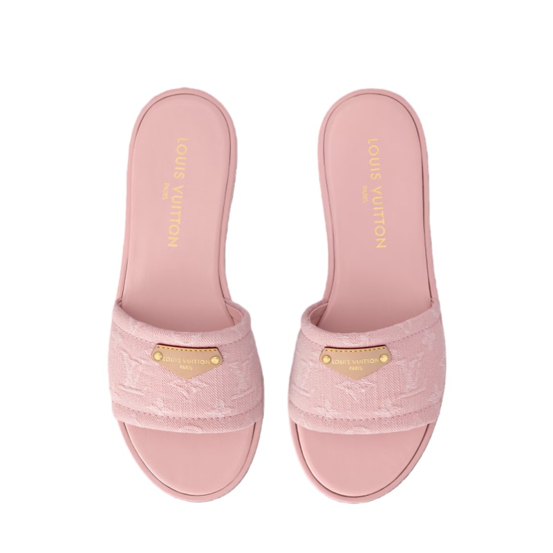 The Lily flat mule is a casual-chic style in emblematic Monogram denim. It features a wide front strap, which is signed with a Louis Vuitton-embossed natural leather label and a gold-toned stud, referencing the leather goods collection. The supple leather outsole has a rubber insert for enhanced comfort.