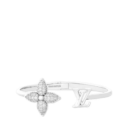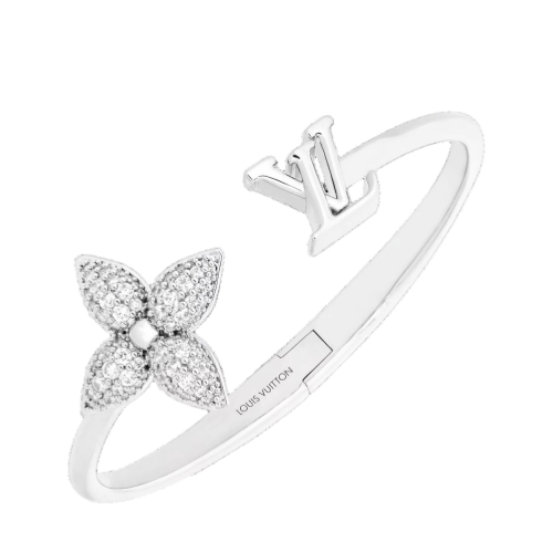 Emanating elegant sophistication, the Louisette Signature Strass bracelet is ideal for the festive year-end season. Exquisitely crafted in palladium-toned metal, it combines the iconic LV Initials with a star-shaped Monogram Flower, studded with rhinestones for a touch of dazzle. Easy to stack for a personalized look, it offers an original way to wear the Louis Vuitton signature.