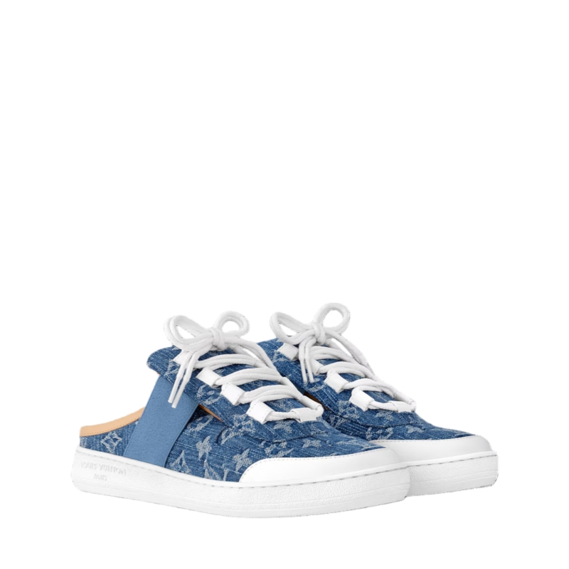 The Lous open-back sneaker is a relaxed, on-trend style, which this season is interpreted in Monogram denim. This model is notable for its tonal elastic inserts, which allow it to be slipped easily on and off. The upper features thick double laces and trim in natural leather, an emblematic material referencing Louis Vuitton leather goods.