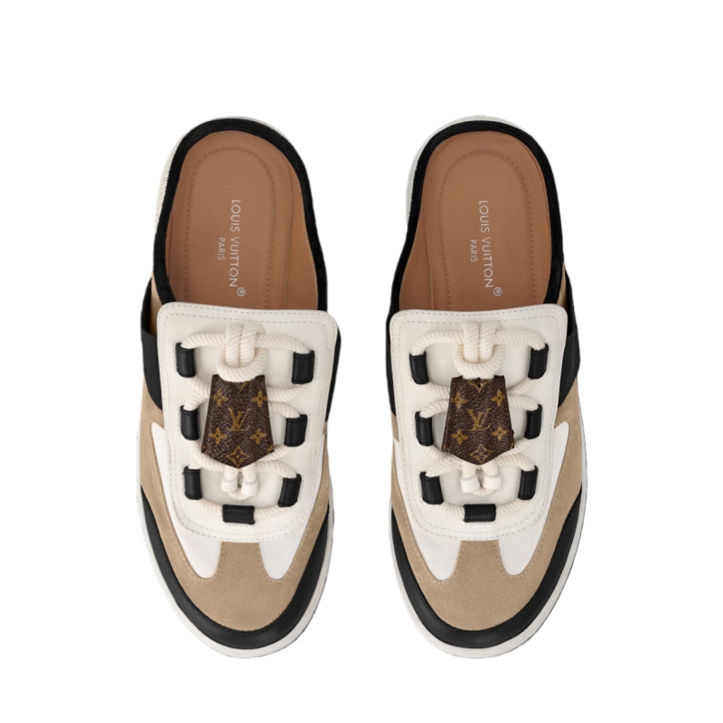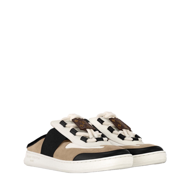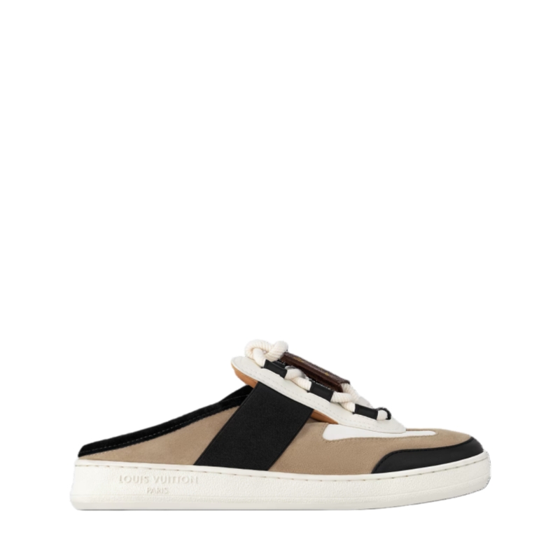 The Lous open-back sneaker in suede calf leather is updated this season with crisscrossing laces and a key bell in Monogram canvas, referencing the Leather Goods collection. This versatile and stylish sneaker features discreet elastic inserts for easy fitting. It is finished with a supple rubber outsole bearing the Louis Vuitton signature.