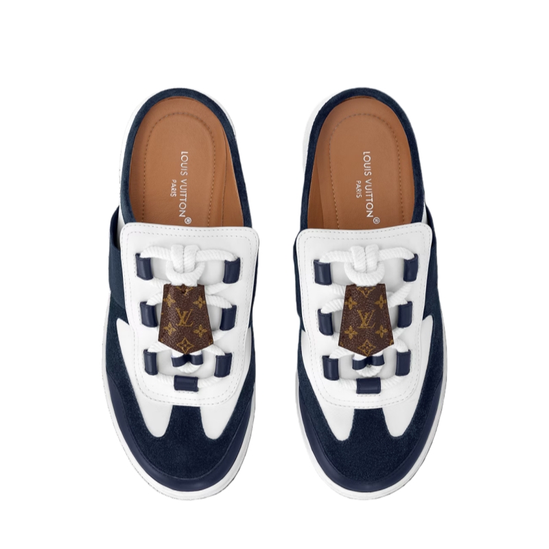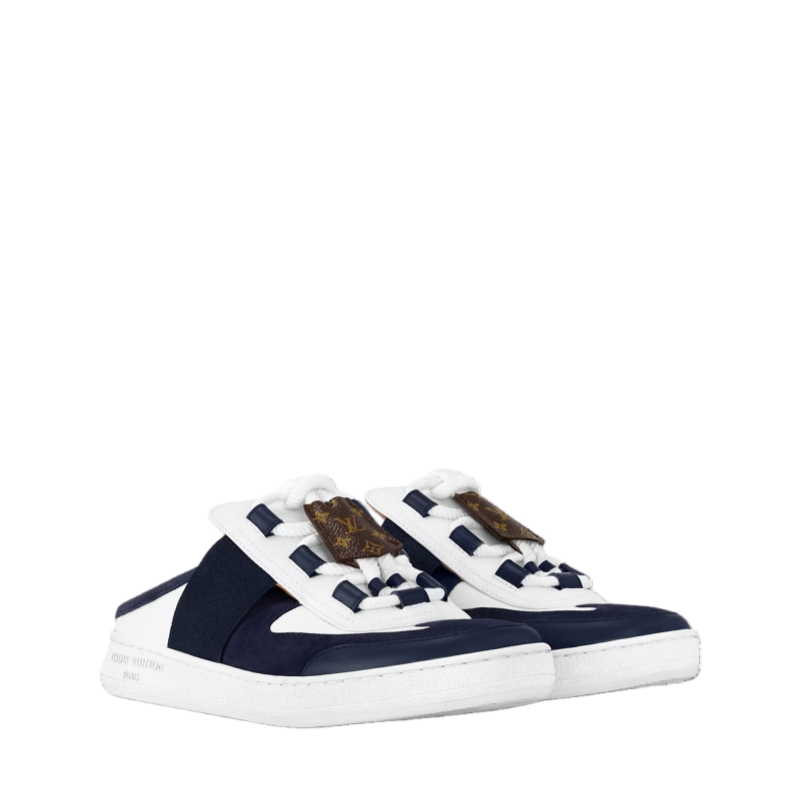 The Lous open-back sneaker is given a chic, nautical twist in suede calf leather. This model is notable for its thick, crisscrossing laces, which are embellished with a key bell in Monogram canvas, referencing Louis Vuitton Leather Goods. Discreet elastic inserts allow the sneaker to be slipped easily on and off.