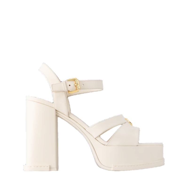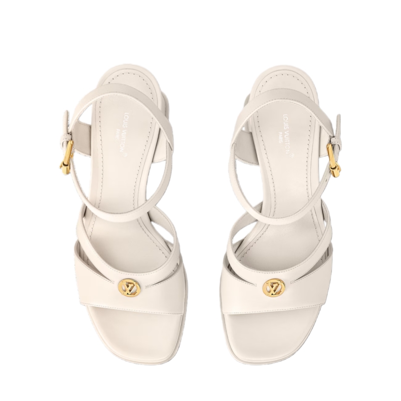 The Maya heeled platform sandal is crafted from smooth calf leather, which also covers its chunky heel and platform, creating a sleek look. Gold-toned details complement this design: an LV Circle signature on the front and a square buckle on the adjustable ankle strap. It is finished with a rubber outsole for comfort and durability.