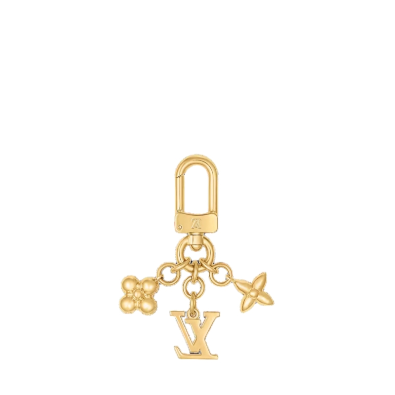 Meticulous detailing and fine materials make the Charms LV Iconic key holder a precious everyday companion. The gold-tone metal snap hook holds a trio of House emblems: the LV Initials plus two different Monogram Flowers, all enhanced with dazzling crystals. Practical and pleasing to the eye, it adds a delicate touch of brightness to a key ring.