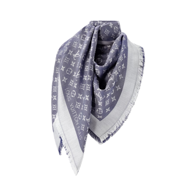 Ideal for everyday use, this luxuriously soft Monogram Denim shawl is subtle and very feminine. Entirely weaven in jacquard, it features the Louis Vuitton signature and the Monogram pattern.