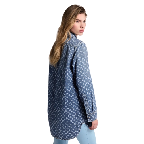 This shirt is reimagined for the season in lightweight denim featuring an allover print of the iconic Monogram motif for a summery signature look. It is cut in a relaxed straight cut for effortless everyday styling, while a smart collar and buttoned cuffs nod to classic tailoring codes.