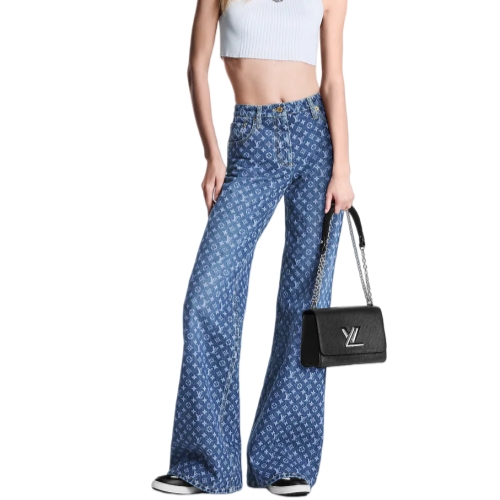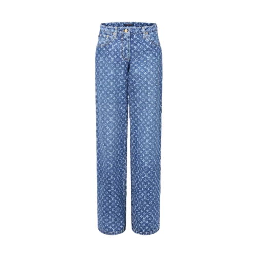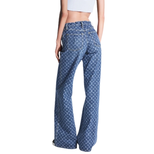 These jeans make a chic statement in comfortable washed denim featuring the iconic Monogram motif as a graphic allover signature, while contrasting yellow topstitching highlights the construction for a classic look. They are cut in a casual flared shape for elevated everyday styling, complete with five practical pockets.
