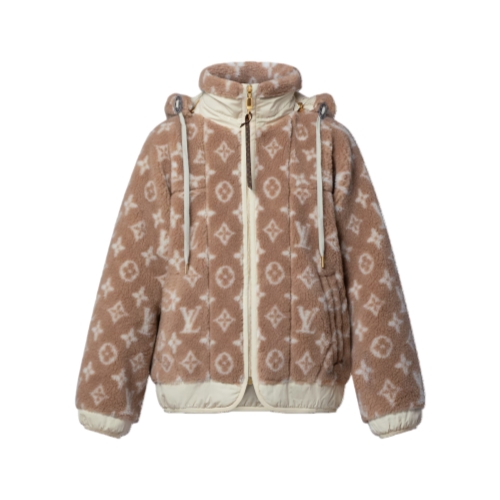 This zip-up jacket is crafted from soft, fuzzy wool-blend fleece in a scaled-up Monogram motif for a cozy, signature look. The casual oversized shape is framed with color-blocked accents for a sporty feel, while the high neckline and generous drawstring hood underscore the warm, wintry appeal. Complete with two practical side pockets.