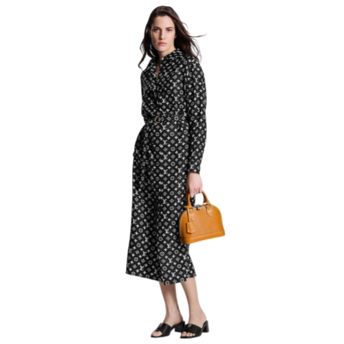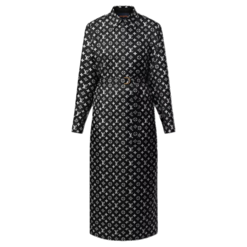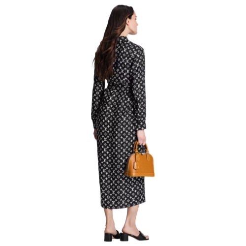 This elegant shirt dress is crafted from soft, fluid silk twill featuring a graphic allover print of the iconic Monogram motif. Long sleeves and a collar nod to classic tailoring styles, while a covered button tab and a slim tone-on-tone belt complete the look with a clean, flattering finish.