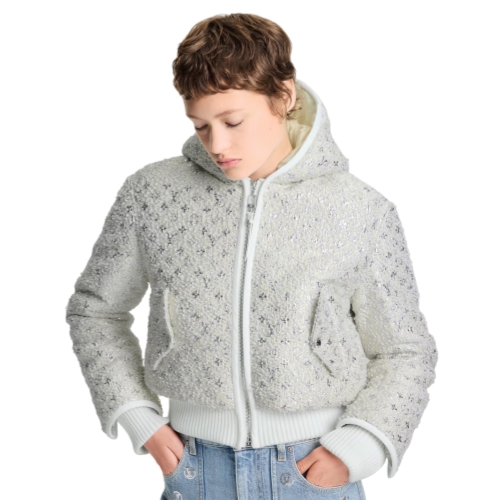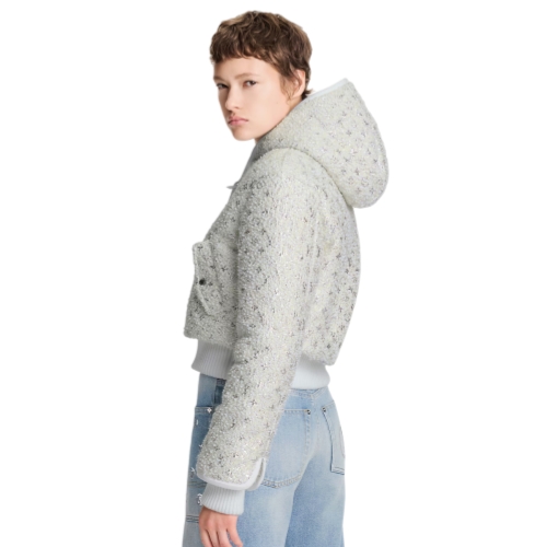 Sparkly and sporty, this hooded jacket is crafted from this season’s signature tweed in a soft, textured finish with the iconic Monogram motif subtly woven in shimmering lurex. The cuffs and cropped waistline are trimmed with tonal ribbing for a trim fit, while a silver-toned zipper fastening and snap-button side pockets complete the look.