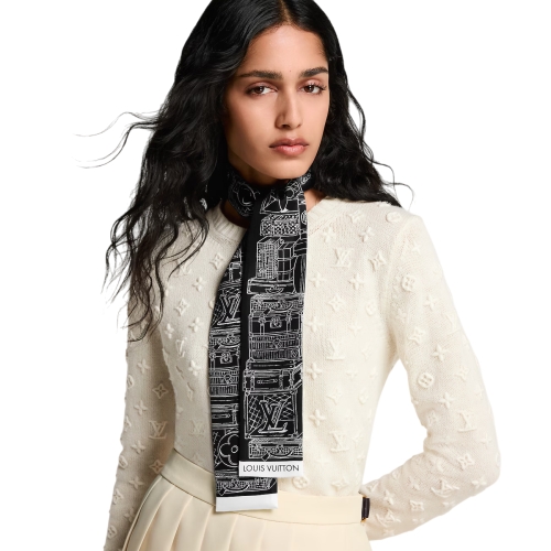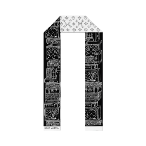 The artistic design of the My LV Luggage bandeau is infused with the spirit of travel and elegant adventure. Printed on sumptuous silk, an intricate array of historic Louis Vuitton trunks is combined with Monogram Flowers and the LV Initials for a creative signature. A versatile, stylish accessory, and a tribute to the House’s heritage and savoir-faire.