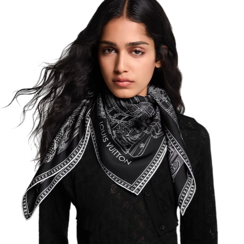 The My LV Luggage square is a tribute to the House’s legendary heritage and savoir-faire. Printed on fine silk, a minutely detailed pattern of classic trunks and bags is accented with the iconic Monogram Flowers and LV Initials for a subtle signature. A timeless accessory, and an elegant evocation of the pleasures of travel with Louis Vuitton.