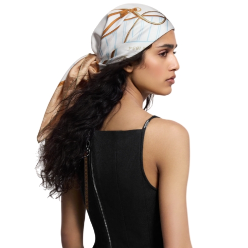 Inspired by a classic handbag, the My Neverfull square is an ode to the House’s luggage-making legacy. Printed on pure silk, its eye-catching design depicts the straps of the Neverfull bag, accented by timeless icons like an LV Circle and a padlock. A Louis Vuitton patch recalling the House’s historic trunks adds an elegant heritage touch.