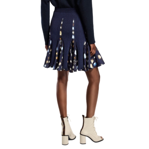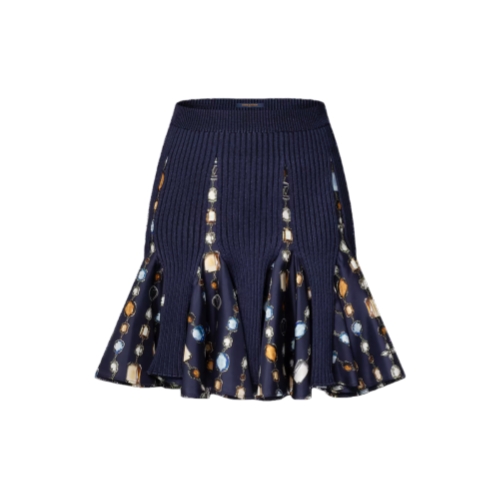 This skirt makes a playful seasonal statement. It is knitted in a clean, figure-skimming silhouette from ribbed cotton blend in a refined seasonal shade, while satin godet inserts introduce spirited volume and color in the collection’s striking necklace print, which twists Louis Vuitton charms with richly hued precious gemstones.