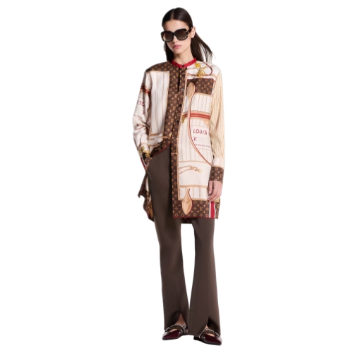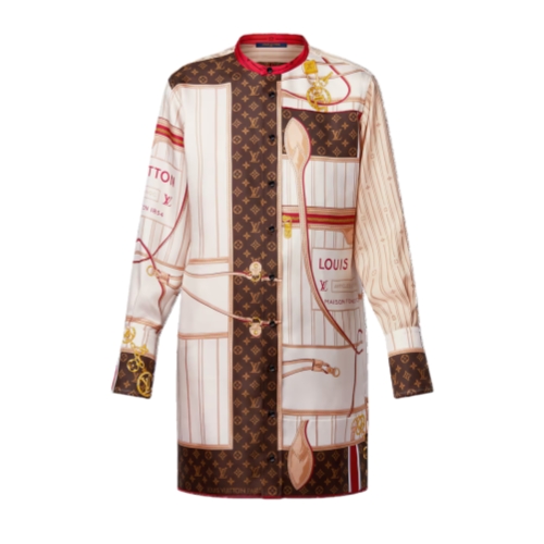 This silk twill dress makes a bold signature statement in an allover foulard print that twists detailing from the House’s iconic Neverfull handbag with classic Monogram accents. It is cut in a straight shape with a collarless neckline and a button tab on the chest, while exaggerated cuffs and an asymmetrical cut-out hem underscore a breezy, contemporary feel.