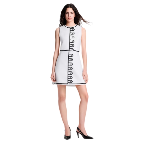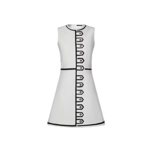 A sophisticated statement. This dress is crafted from structured wool-silk mikado in a clean-cut A-line silhouette with a chic golden zipper at the back. In homage to the Pop Art movement, it is highlighted with graphic black lines that playfully trace the outline of the House’s signature leather snap-button tabs for a bold trompe l’oeil look.