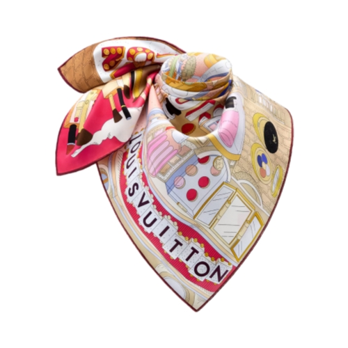 Styled in sumptuous silk, the Paris En Beauté square is an eloquent ode to the world of beauty. Its intricate design depicts Parisian buildings and landmarks accented with glamorous feminine details like lipsticks and powder compacts. Playful references to the Monogram pattern and the House’s travel heritage add a creative signature touch to this elegant, versatile accessory.