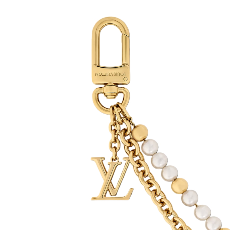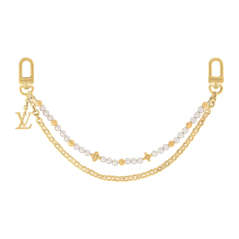 The eye-catching Pearl River bag charm reinterprets the House’s beloved emblems with feminine elegance. Its refined design pairs a delicate gold-toned metal chain with a string of lustrous white resin pearls, accented by Monogram Flowers and the LV Initials. Long enough to adorn a larger handbag, it attaches easily with its dual snap hooks.
