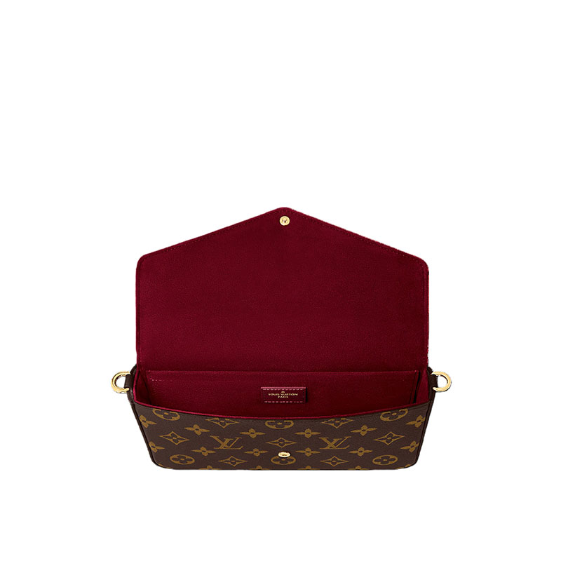 The versatile Pochette Félicie flap pouch is fashioned from Monogram canvas and lined in fuchsia microfiber. Inside there are two removable pockets: a zipped pocket and a flat pocket with eight card slots. The removable gold-color metallic chain enables shoulder and cross-body carry. The Félicie closes with a press-stud.