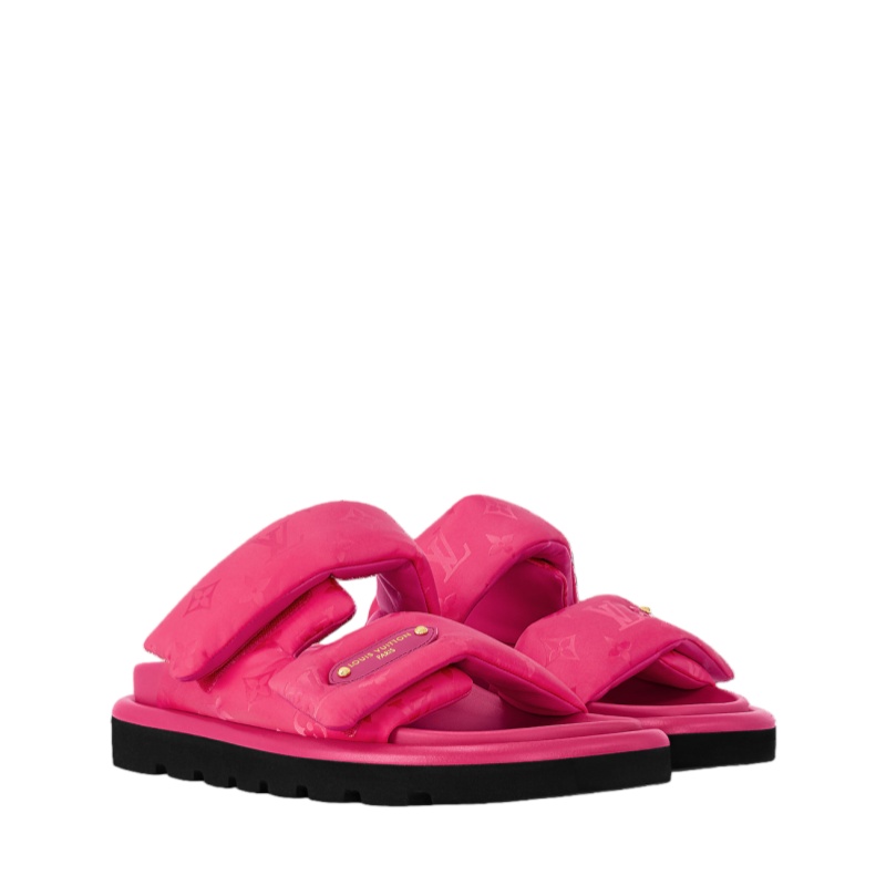 The Pool Pillow comfort mule comes in technical nylon with a tone-on-tone Monogram pattern. This model is characterized by its two cushiony straps, which are adjusted with velcro and lined with leather, its anatomic footbed and its lightweight micro outsole. The front strap is embellished with a Louis Vuitton-embossed leather label and two tiny studs.