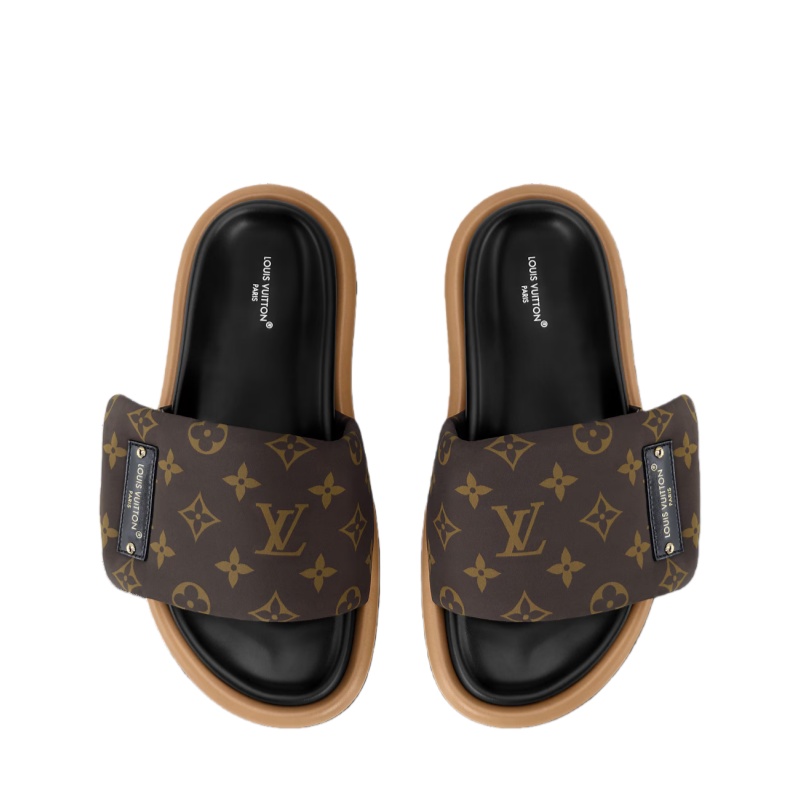 The Pool Pillow flat comfort mule features a padded front strap in Monogram nylon. The strap is adjusted with velcro and embellished with a leather label embossed in gold with the Louis Vuitton signature. Designed for optimum comfort, this model has a padded anatomic footbed and a lightweight micro outsole.