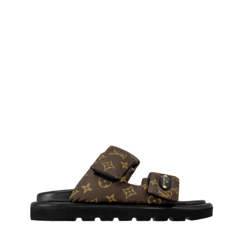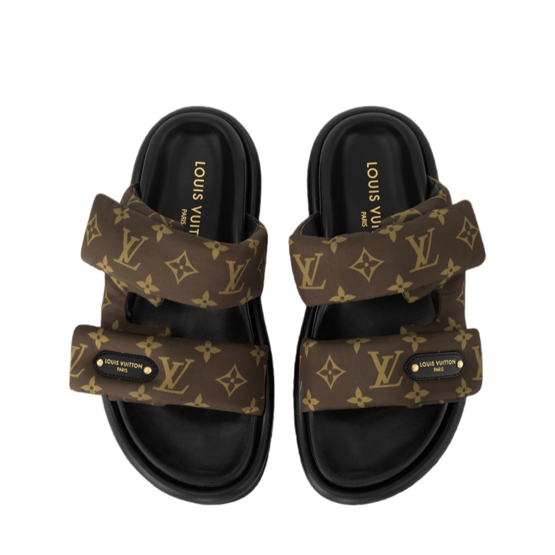 The Pool Pillow comfort mule is revisited with two padded, adjustable straps in Monogram nylon, which are lined with leather for comfort and durability. The front strap is embellished with a leather label embossed with the Louis Vuitton signature. This easy-to-wear style is finished with a comfortable anatomic footbed and a lightweight micro outsole.