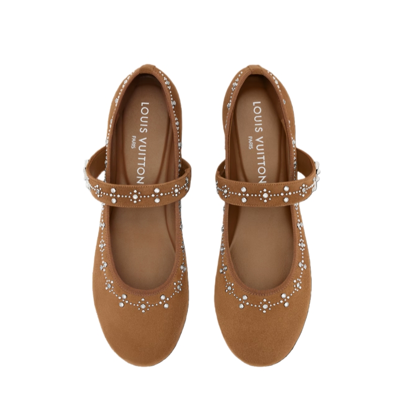The Romy flat ballerina is reimagined this season in suede baby goatskin. The soft leather is embellished with a delicate pattern of tiny, silver-toned studs, which runs all around the upper. The strap, which is a distinctive feature of this round-toe ballet pump, is also decorated with studs and signed with an LV Twist accessory.