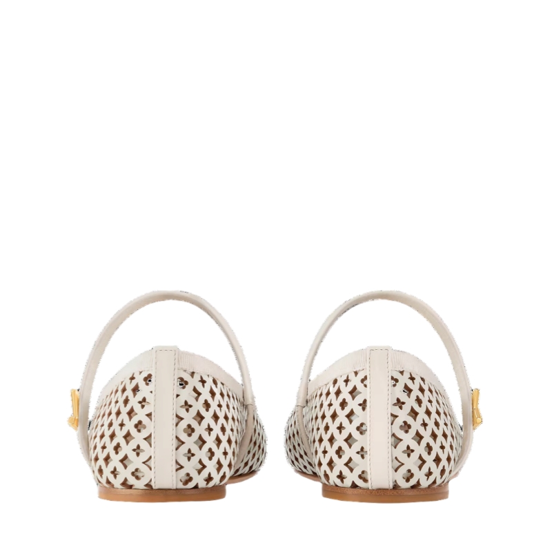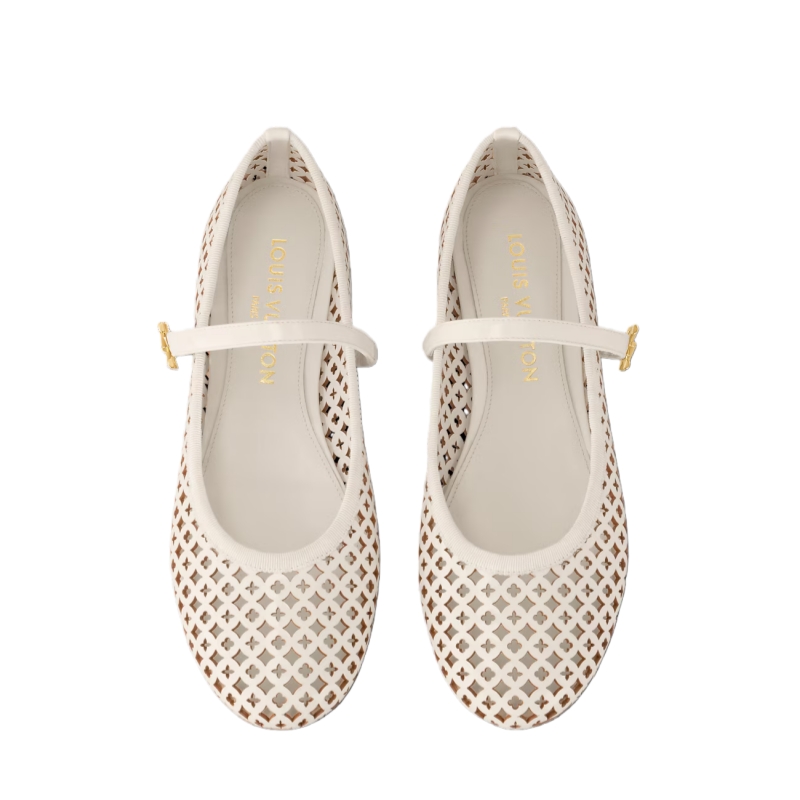 This interpretation of the Romy flat ballerina comes in patent calf leather, which is embellished with delicate Monogram Flower perforations. Other refined details are the grosgrain trim around the upper and the slender strap, which is signed with a gold-toned LV Initials accessory. This timeless, round-toe ballet pump is finished with a fine leather outsole.