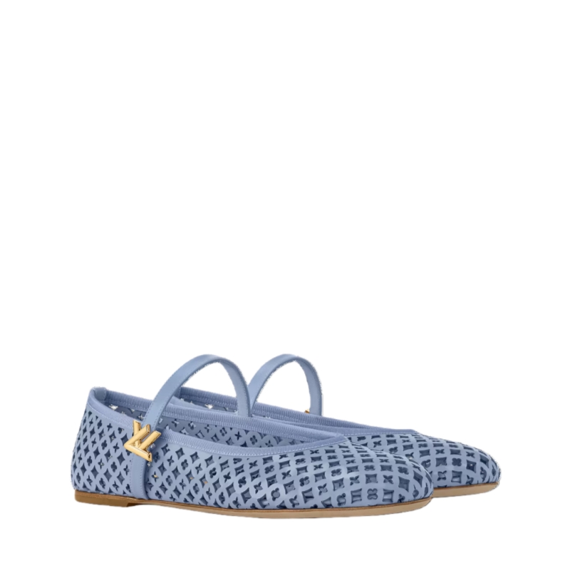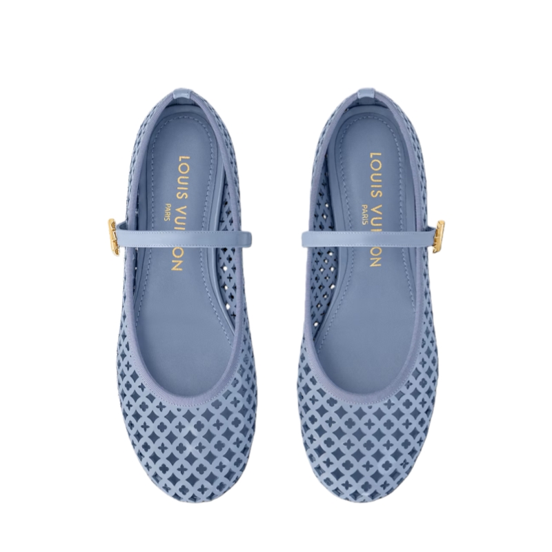 This interpretation of the Romy flat ballerina comes in patent calf leather, which is embellished with delicate Monogram Flower perforations. Other refined details are the grosgrain trim around the upper and the slender strap, which is signed with a gold-toned LV Initials accessory. This timeless, round-toe ballet pump is finished with a fine leather outsole.