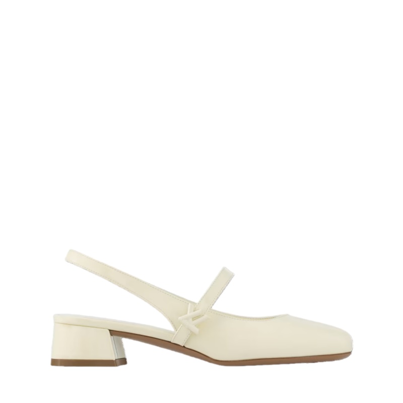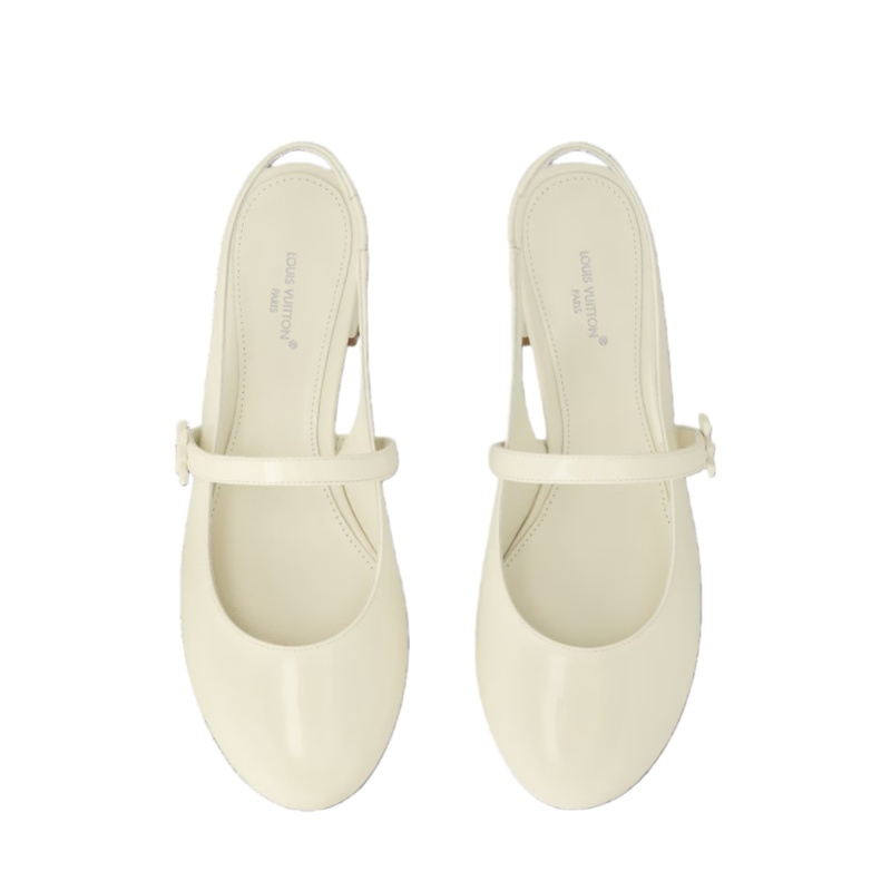 Glossy patent calf leather complements the sleek lines of the Romy slingback pump. This elegant style is characterized by its rounded toe and low block heel, which make it extremely comfortable to wear. The slender strap across the foot is embellished with a tonal accessory inspired by the iconic LV Twist bag.
