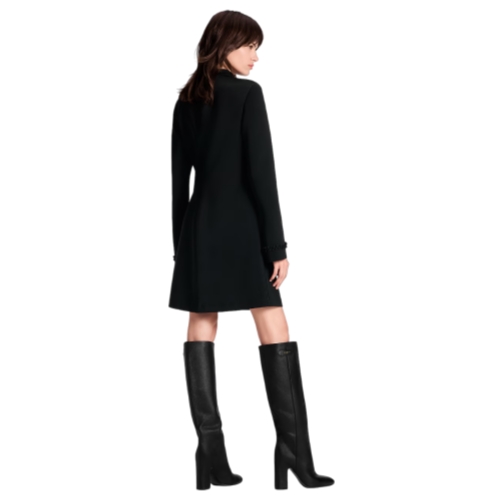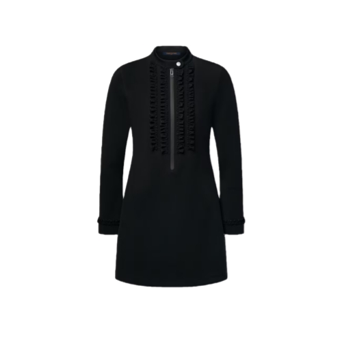 This dress has a clean, contemporary look in the House’s signature technical jersey. It is cut in an elegant silhouette with long sleeves and a lightly tapered waist. The snap-button collar and coated zipper fastening at the neckline introduce a sporty vibe, which is offset by romantic ruffled trims on the chest and cuffs.