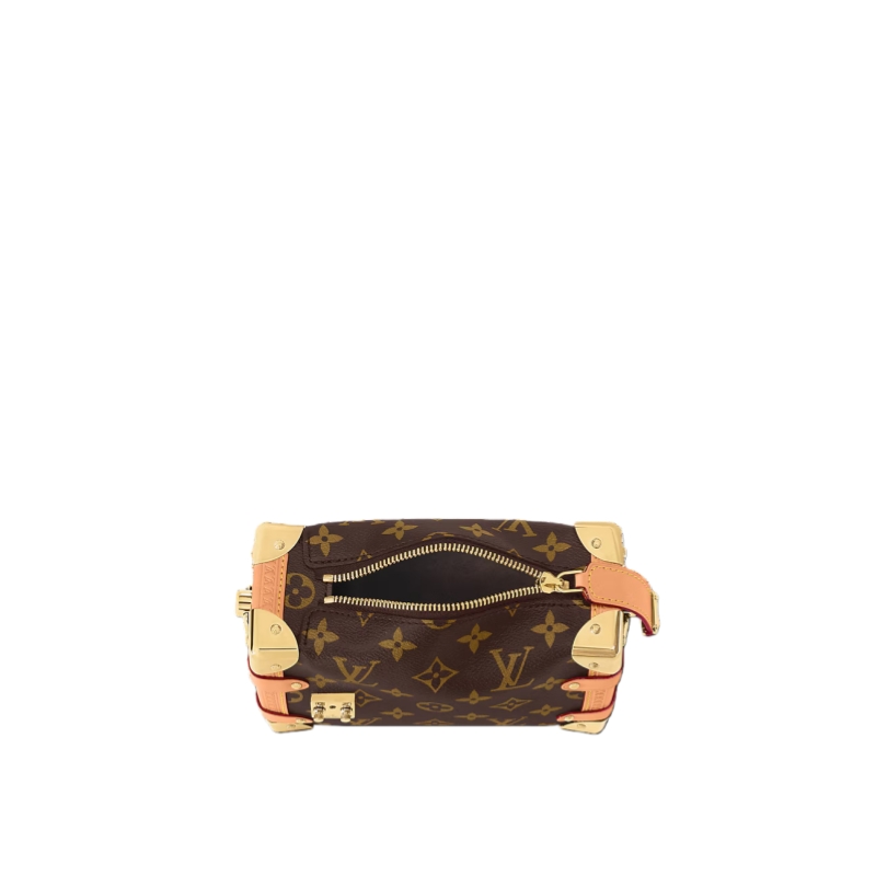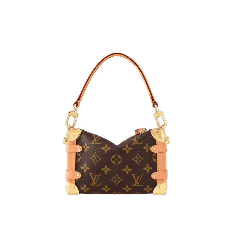Evocative of the House’s historic trunks, the Side Trunk PM’s rectangular shape is fashioned from Monogram canvas with cowhide-leather trim and gold-color hardware. The reinforced corners and S-lock attached to the zipper are directly inspired by Louis Vuitton trunks. It can be carried by hand or on the shoulder thanks to the removable and adjustable leather strap.