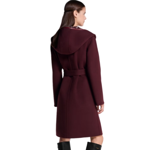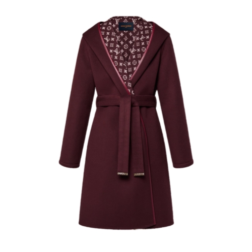 The House’s signature long wrap coat is revisited for the season in an elegant jewel tone. It is cut from a plush double-face blend of wool and silk with a graphic Monogram jacquard signing the inside. The edges are trimmed with tonal leather, while a casual self-tie belt adds definition to the waistline.