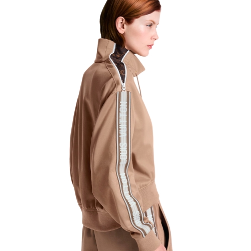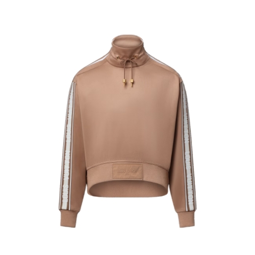 This reworked sweater is casual and comfortable in a soft cotton-blend jersey in a chic cropped shape. The high neckline is embellished with drawstrings at the front, while the left shoulder is trimmed with a contrasting zipper. Louis Vuitton stripes add a graphic sporty accent to the sleeves, while a subtle scarf tag signs the waistband.