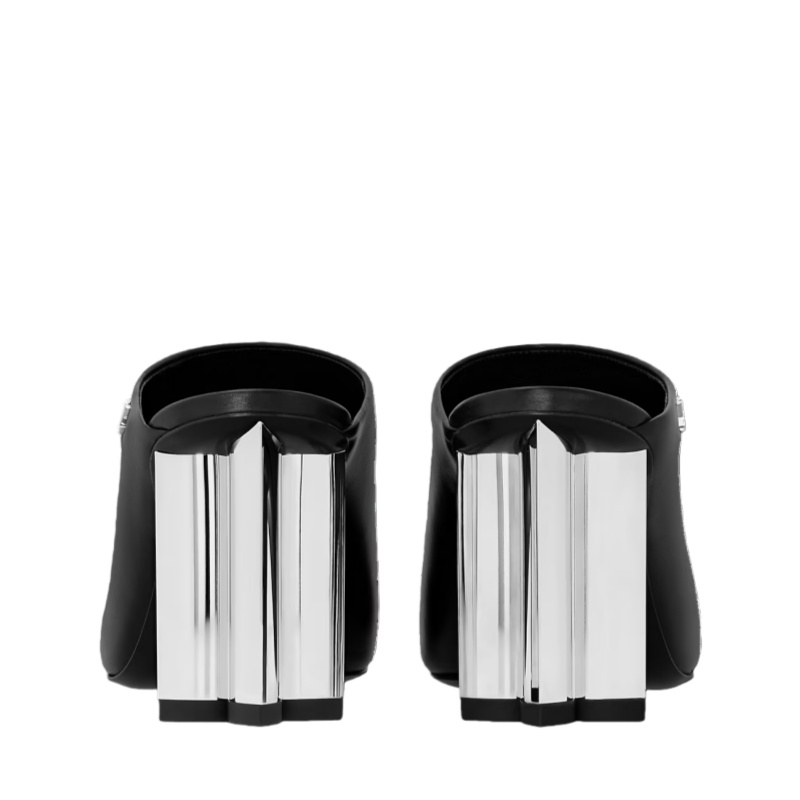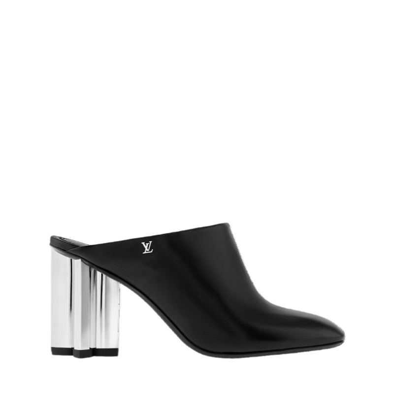 An addition to the iconic Silhouette line, the Silhouette closed mule contrasts a minimalist upper in smooth calf leather with an eye-catching metallic heel in the shape of a Monogram Flower. This elegant style is signed with a silver-tone LV Initials stud and finished with a fine leather outsole.
