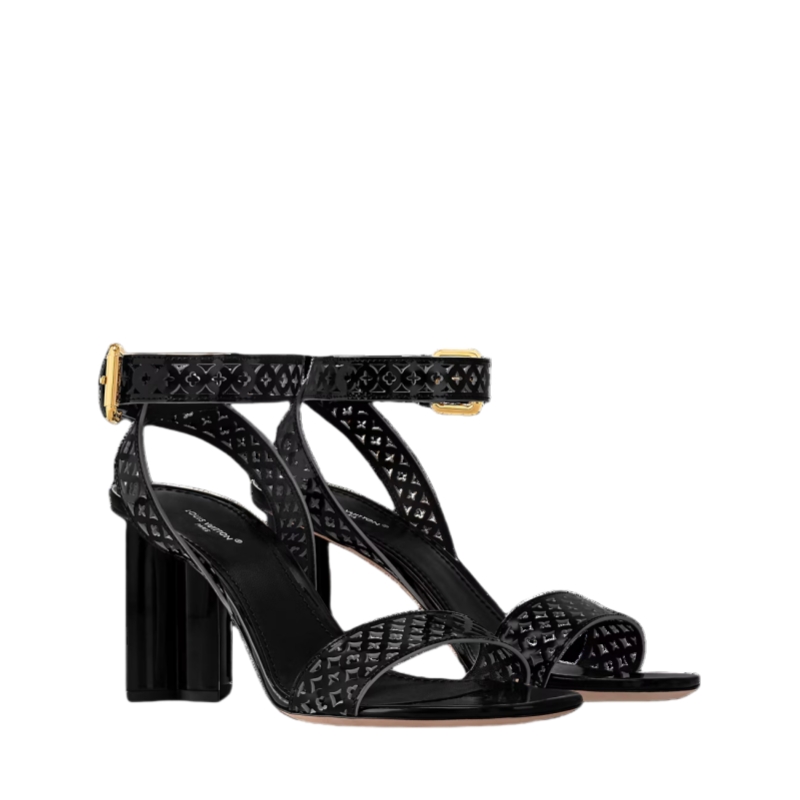 The Silhouette sandal is crafted from patent calf leather with intricate Monogram Flower perforations. This sophisticated style comes on a high heel in the shape of a Monogram Flower, a key signature of the Silhouette line. It fastens around the ankle with an engraved, gold-toned buckle.
